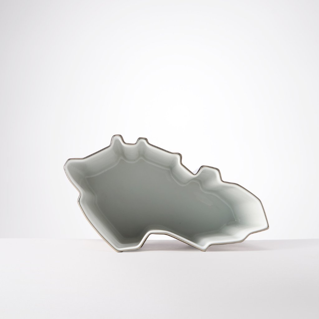 The bowl originally titled Heimweh (homesickness) was part of Maxim Velčovský's master thesis. It represents a specific souvenir in the shape of the Czech Republic, which is loosely based on the work of Finnish designer Alvar Aalto, specifically his series of organic glass vases from the 1930s; it literally became a symbol of national identity, although its pure form made it impossible to place anything in it, so as not to spoil the resulting impression. It therefore often remains empty, as design in the function of free art. Velčovský, on the other hand, chose a specific topographical abstraction, which, although a direct reference to Czech statehood, remains illegible to the uninitiated.