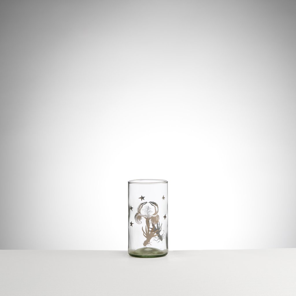 The glass made of recycled transparent glass with a delicate floral decoration in a golden tone combines playful design with a sustainable approach. This original piece is the first blossom of a collaboration between designer Jakub Berdych Karpelis and illustrator Silvia Luběnová. The floral motif is based on the author's childhood memories of the front gardens in Kroměříž - specifically the irises that grew there in abundance. The illustration is applied to the glass using a classic screen printing technique, which is then burned onto the glass.