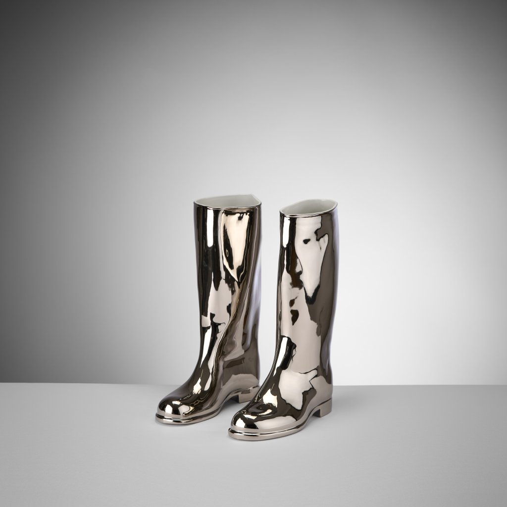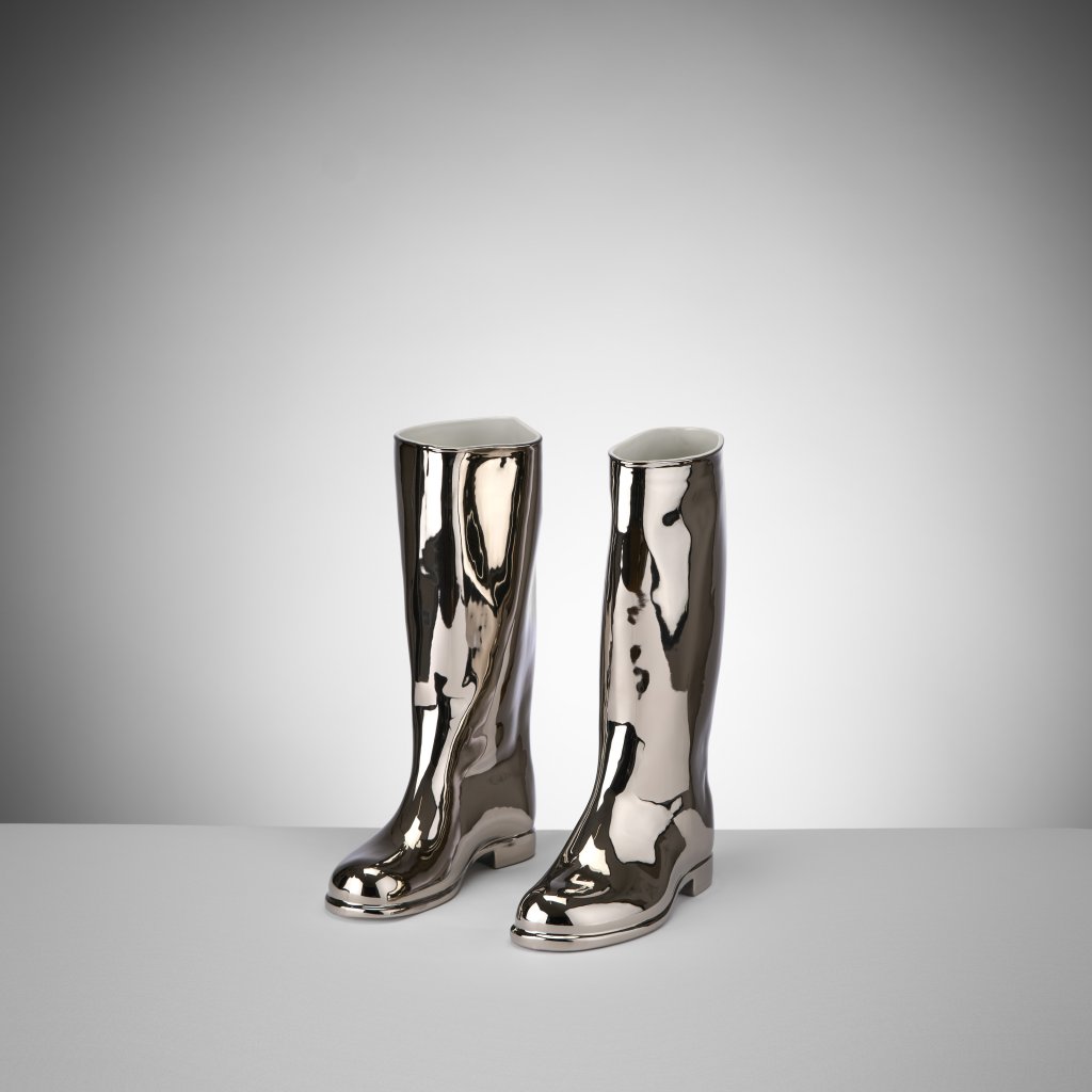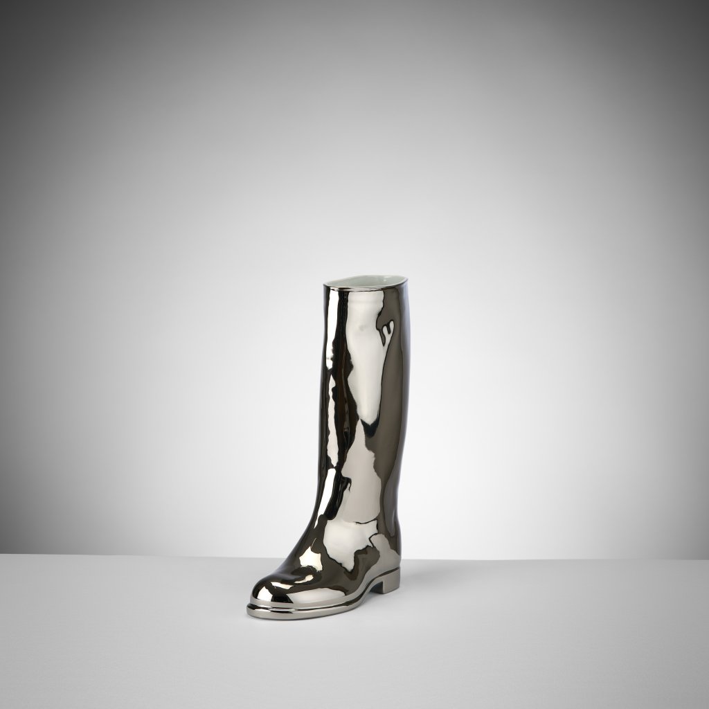 Rubber boot shaped vase, originally white, later expanded in many colour variations, starting with onion decoration and other, mainly plated variations. Part of a thesis with one of the most famous Maxima products. The author's fascination with folkiness, practical aesthetics and trivial charge is already evident here, as well as his desire to reverse a seemingly fatal fate and elevate an ordinary product through noble materials and a change of function.
